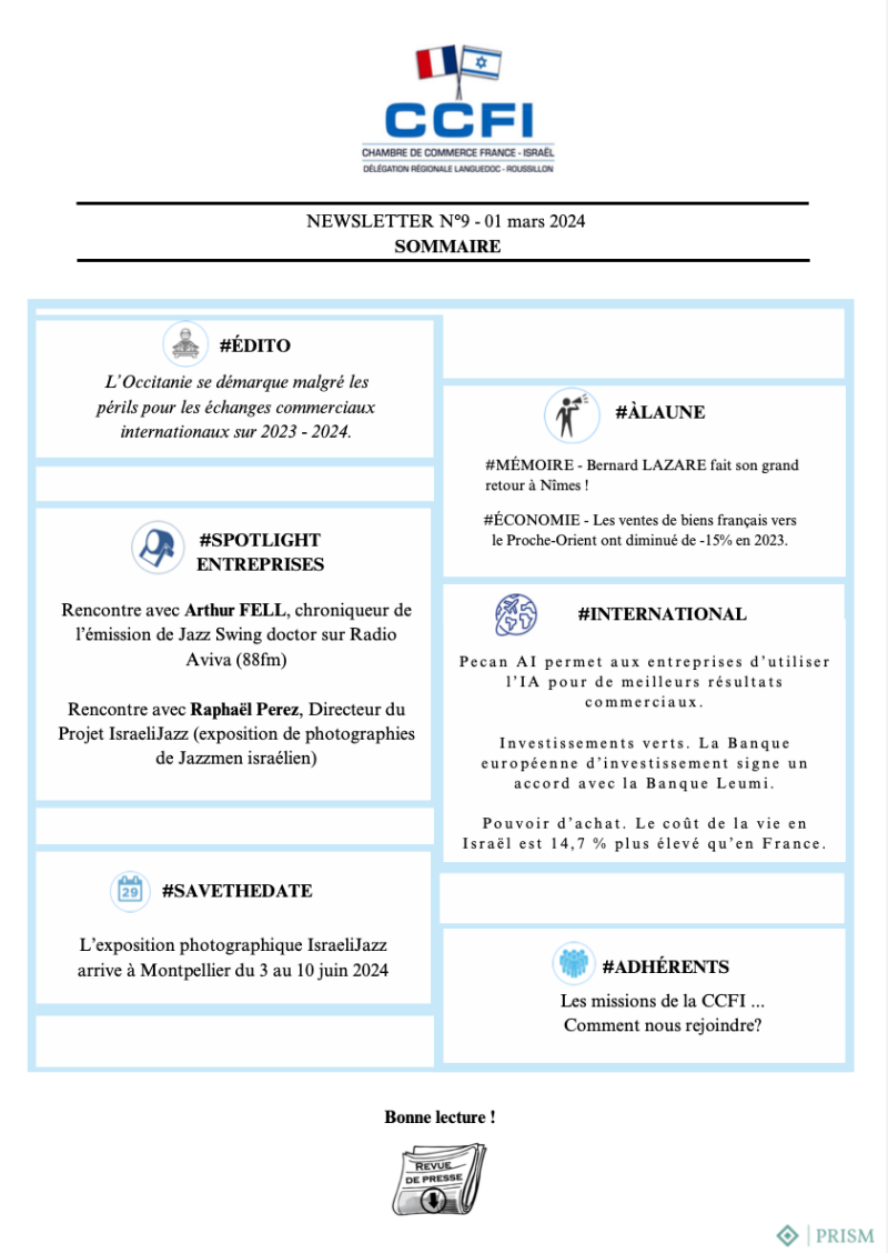 Mise en place en avril 2020 avec une diffusion tous les 4 mois, elle permet de réunir toujours plus, les acteurs du territoire avec nos adhérents et les sociétés en Israël.